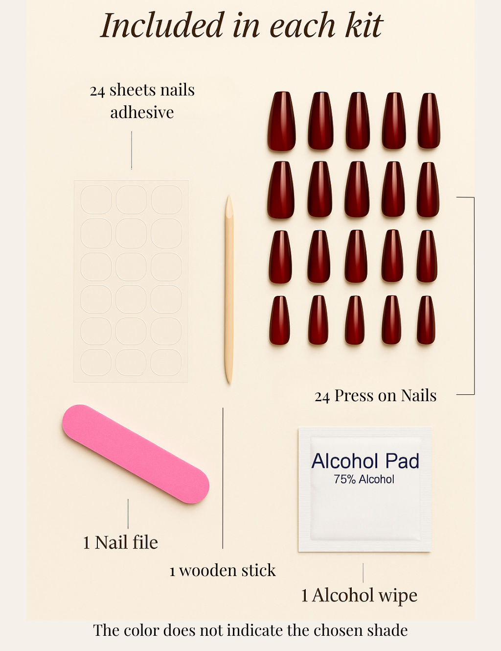 Each kit includes 24 nails in various sizes to fit all nail shapes and widths.